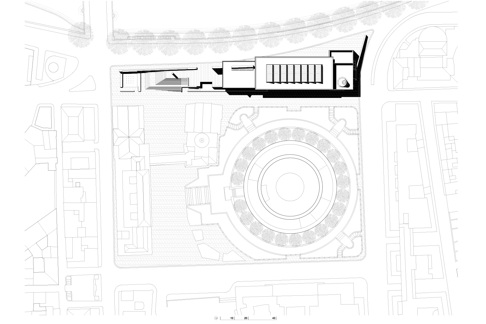 Located on the bank of the Tiber River, this museum provides a renewed setting for the Ara Pacis, a sacrificial altar dating to 9 B.C. Planned as part of an effort to protect Rome’s cultural legacy, the new structure replaced the monument’s previous enclosure, which was in a state of advanced decay. The new structure consists of a long, single-story glazed loggia elevated above a shallow podium providing a transparent barrier between the embankment of the Tiber and the existing circular perimeter of the mausoleum of Augustus, built circa 28 B.C.