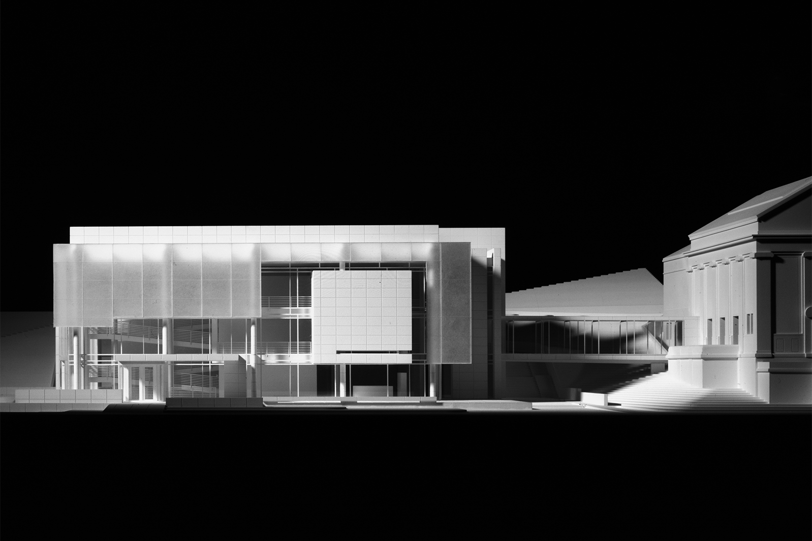 The three-story museum is accessed from a main portico facing east. At the second floor a glazed bridge links the building to the plinth of the Kunsthalle. This bridge has been delicately detailed so as to intrude as little as possible on the character of the existing museum. Upon entry, visitors turn right through the lobby to arrive at a monumental ramp, set on axis with the bridge linking to the Kunsthalle one floor above. This ramp provides the primary means of vertical circulation throughout the building, affording access to a major gallery suspended above the ground-floor space as well as to auxiliary exhibition volumes on both the lower ground floor and on mezzanine levels overlooking the entry.