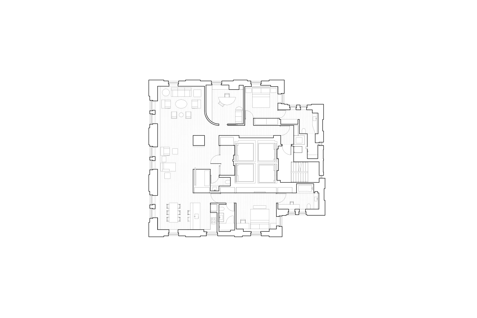 The design strategically transforms the original layout to maximize the extraordinary views of Central Park offered by the tower’s location on Fifth Avenue. A carefully selected palette of materials is combined with clean, modern detailing to re-interpret the landmark building’s refined elegance for a contemporary dwelling. The heart of the apartment is an expansive, flowing space created by combining a series of rooms that had been separate in the original layout. This contains a living area, informal seating, and a dining area adjacent to the open kitchen, all surrounded by panoramic views of the park.