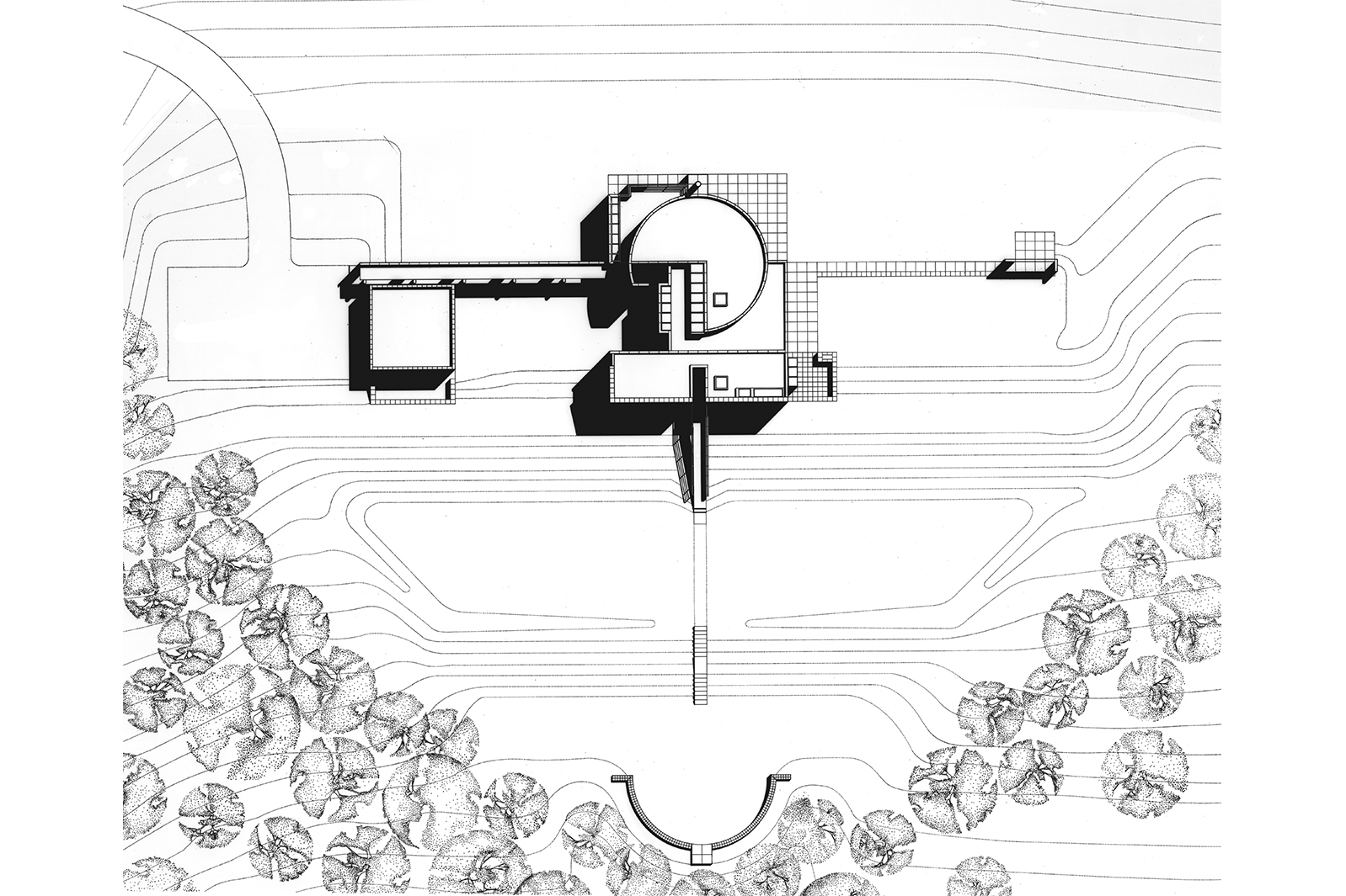 The house is composed around a central cylindrical double-height space, which interplays with the orthogonal geometry of the surrounding volumes. The overlaps and voids in this geometric relationship are manifest on multiple levels, which define both the living areas of the house and places for exhibiting the objects in the owner’s collection, all while maintaining an expansive flow of open space.