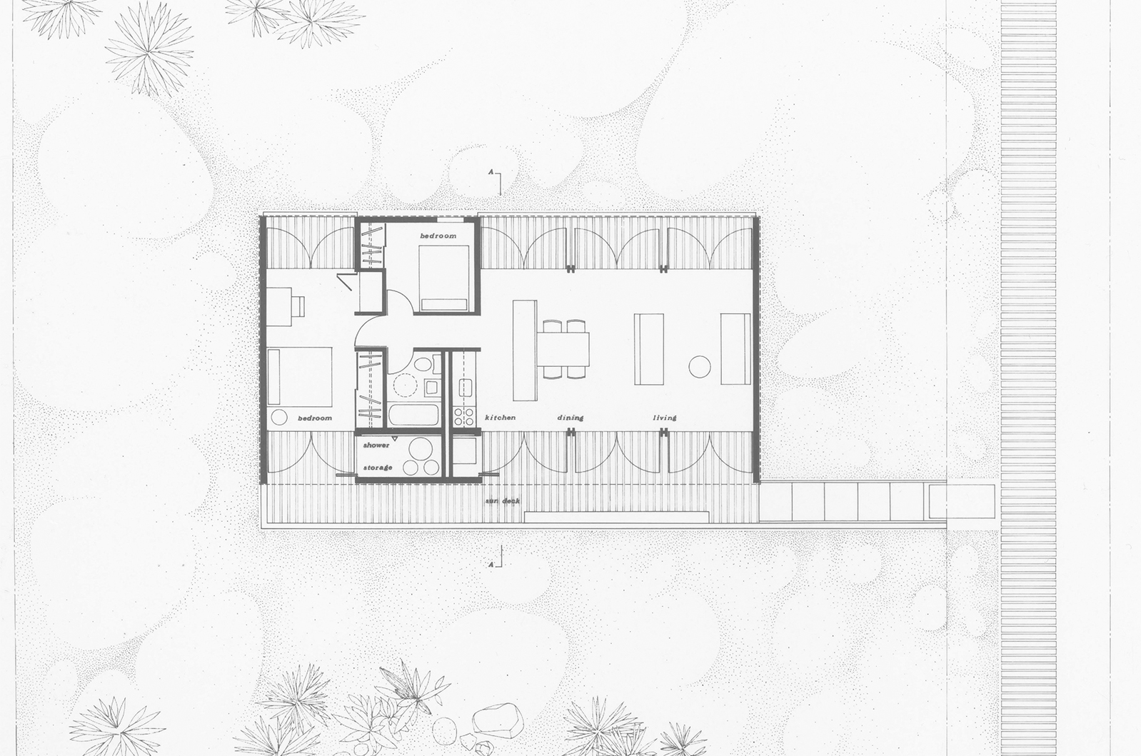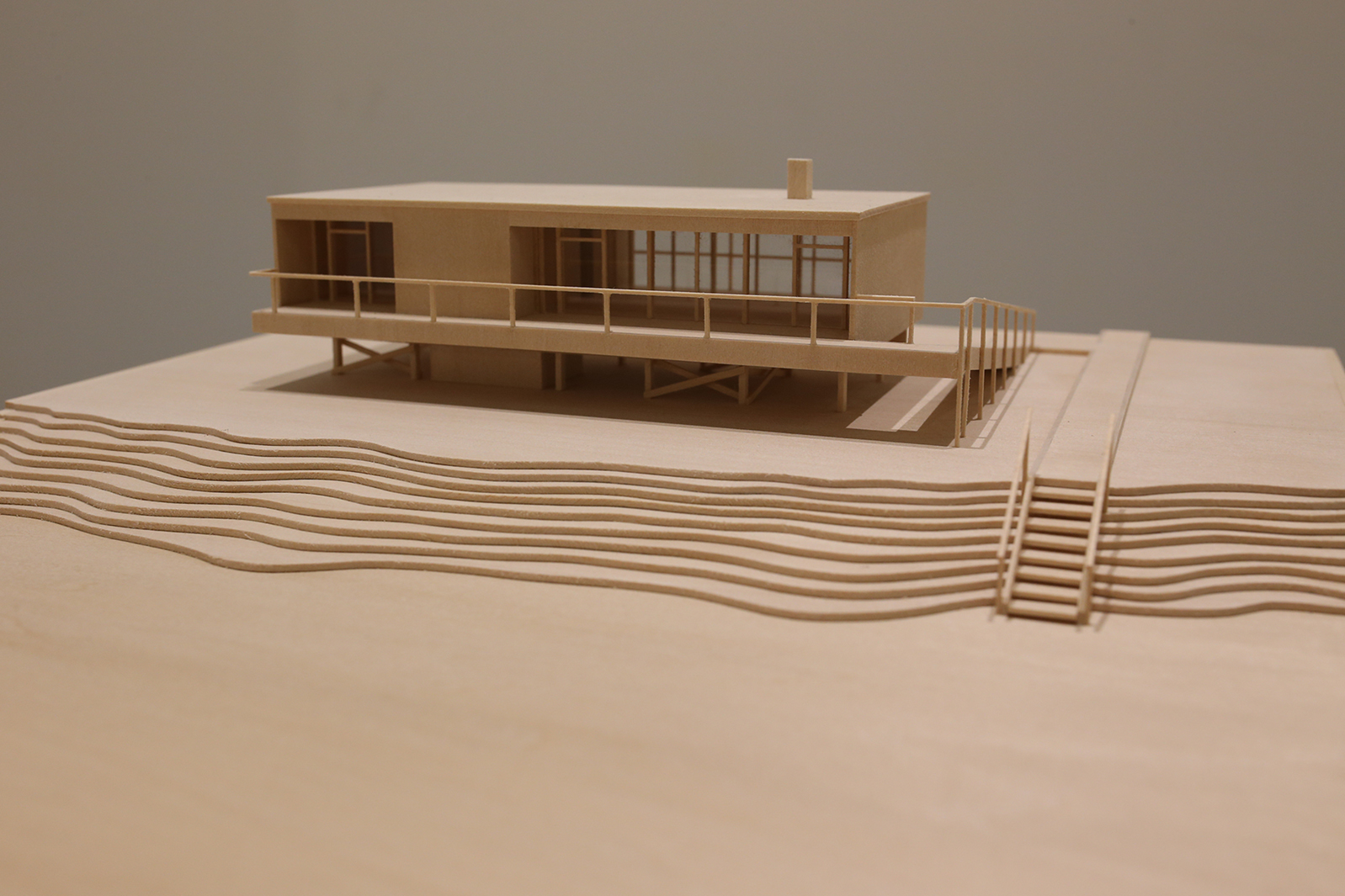 The house was conceived in the greatest simplicity as an assembly of precut timber elements, which were organized into a rigorously simple composition of five structural bays. The house is open on both sides and incorporates the large glass panels and expansive decks that would become hallmarks of Meier’s residential design, allowing panoramic views of both the Atlantic Ocean and the Great South Bay.