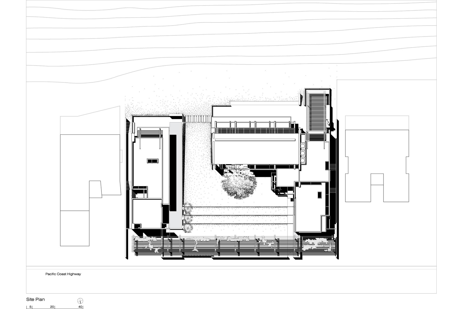 The Malibu site for this house and guesthouse is exceptional in its size and in the amount of ocean frontage it enjoys, both extremely unusual on this south-facing beach. The massing of both buildings has been organized according to a figure-ground diagram that maximizes the potential of these precious commodities.