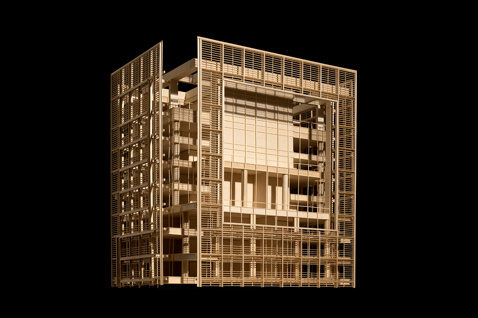 The building’s façade features a delicate louver screen that takes the form of an elegant white veil, inspired by the ventilated protective layers of traditional Middle Eastern clothing. In addition to protecting the building’s clear glass skin from the intense sun, the screen both defines and obscures the distinction between the public image of the building and the private realm within.