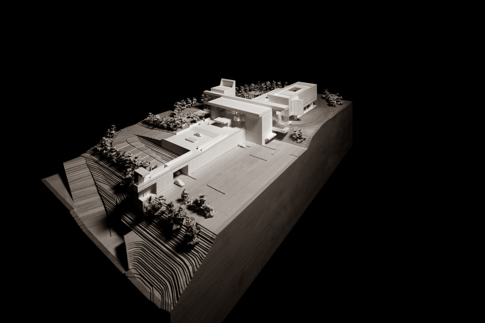 The museum is distinguished by the exceptionally high quality of its interior exhibition spaces. The permanent collection housed in the “cube” is contained within an unusually tall space crowned with a skylight treated with opaque-translucent glass for diffused light. Modestly sized windows are strategically placed to enliven the space with controlled natural light and create framed views towards the park while still maximizing wall space for exhibits. Each gallery has a unique character, with fully capability to control the gradation of natural light and artificial light, allowing curators to set the mood depending on the requirements of the art to be displayed.