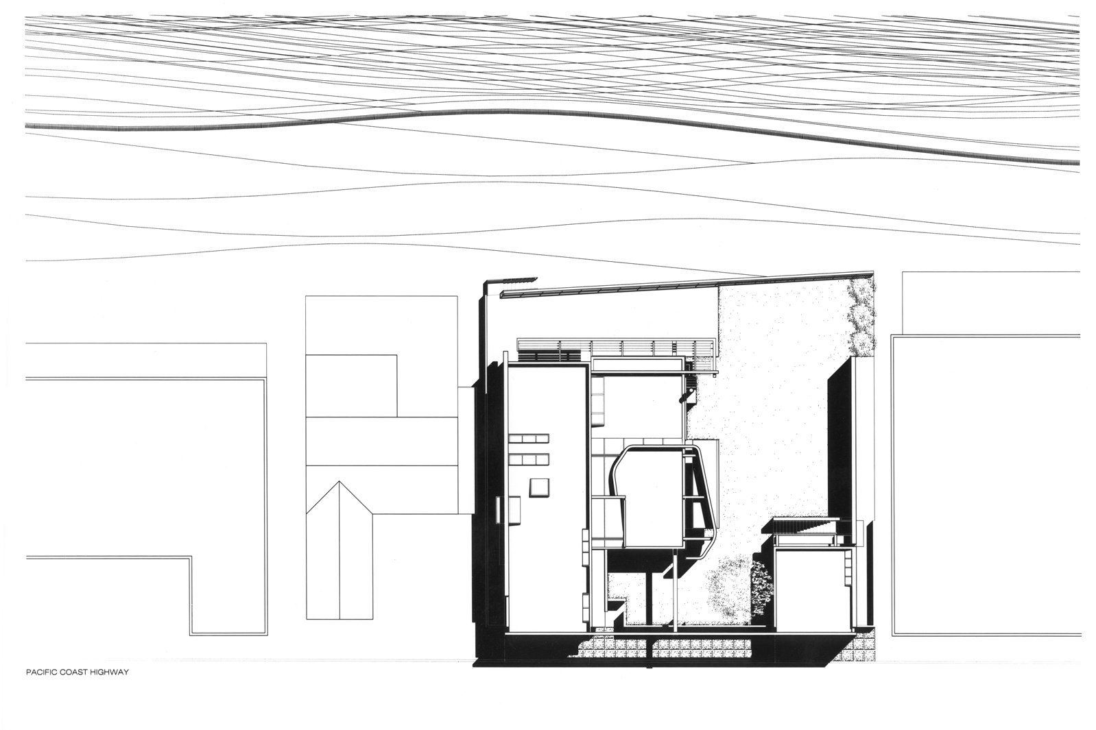 Situated along a densely built section of the Pacific Coast Highway, this house is fronted by the Pacific Ocean to the south and the highway to the north. An open courtyard, inspired by the traditional courtyard buildings of Southern California, creates an exterior living room that stretches along the entire west side of the house and provides a spatial link between the entrance to the property from the highway and the ocean beyond.