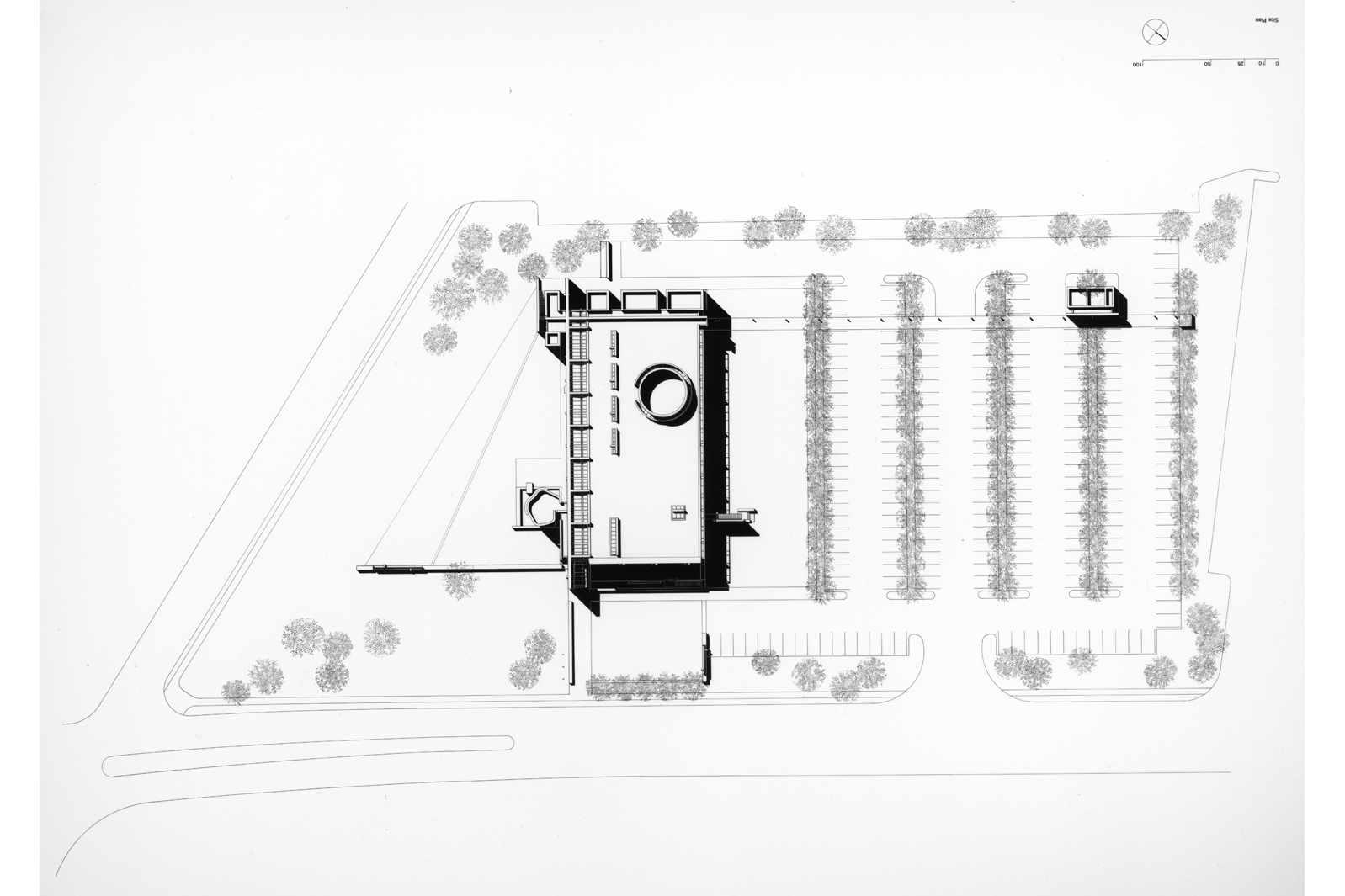 The Swissair headquarters building was conceived as a distinctive formal composition that would stand in contrast to the building’s nondescript suburban environment. The key decision guiding the design process was to recess the building into the ground, accommodating the height restrictions imposed by local zoning guidelines while still fulfilling the requirements of a varied and extensive program. The recessed lower floor also enabled a highly sculptural interaction between the building’s architecture and the dynamic topography of its site, creating inviting outdoor spaces for the company’s staff and establishing a new prototype for exurban office buildings.
