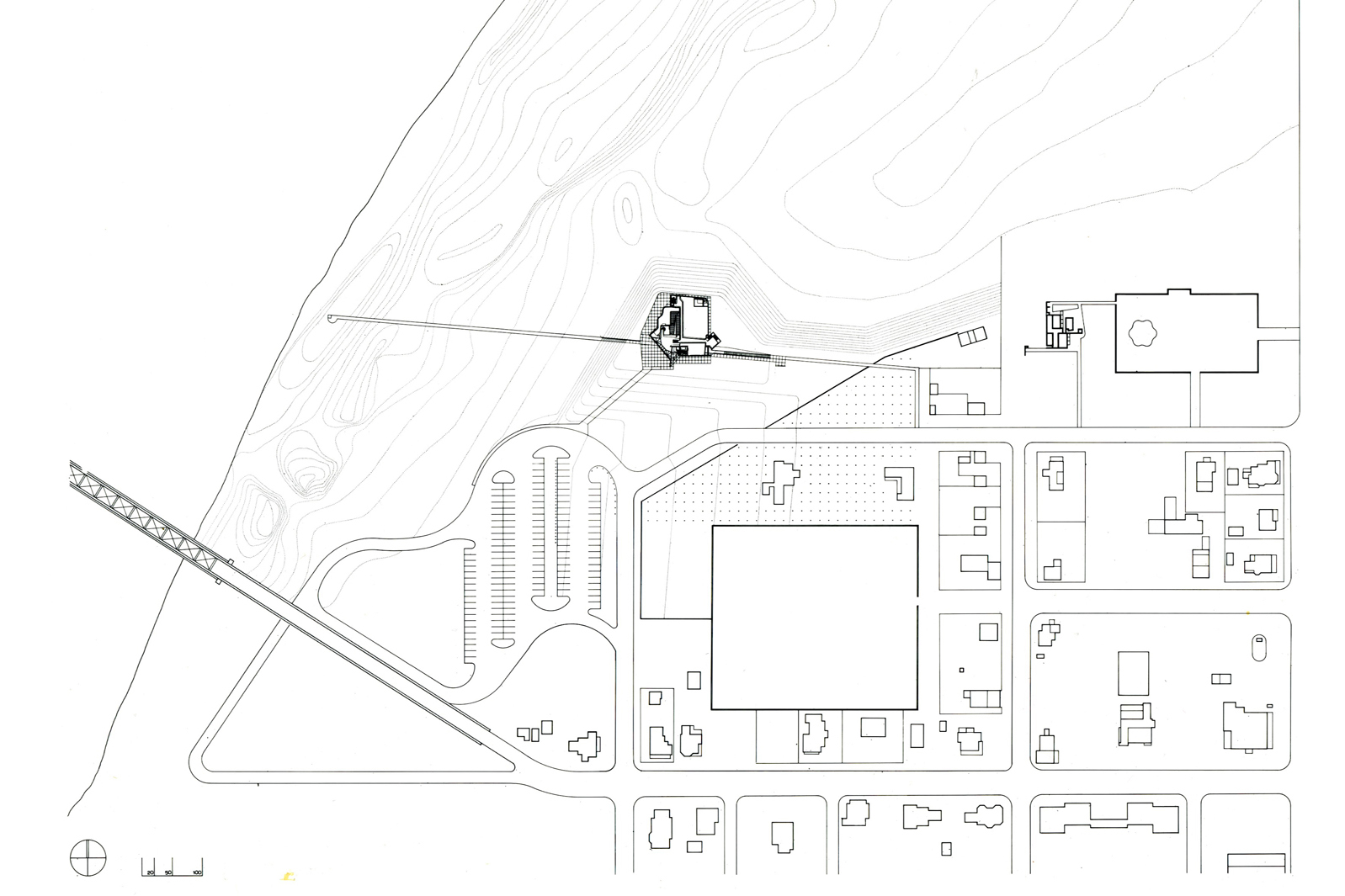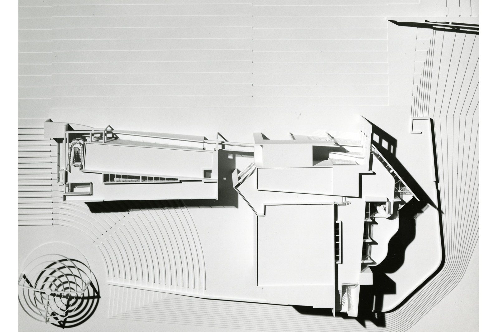 Visitors approach the building along a path leading through a field. Once they cross the threshold, their circulation through the building is a continuous experience, mediated by the design of a complex interior ramp. At the ramp’s culmination on the uppermost roof terrace, visitors find themselves confronted with the town below. This small space affords a panoramic vista like that from the prow of a ship. Visitors then descend by way of a second ramp—this one elongated and stepped, an uncoiled version of the first one—leading out of the building and into New Harmony itself. The heart of the Atheneum is the internal ramp, which ensures that visitors’ circulation throughout the building is a continuous experience. As the ramp winds upward from the orthogonal grid of the ground floor plan, the entire building is set in motion; the geometry of overlaid grids induces a sense of spatial compression at certain points and spatial tension at others. Throughout, the ramp is illuminated by light from above, with staggered interior slots framing the essential spaces within the building and windows offering glimpses of the historic town and the landscape beyond. This timeless design has been recognized by the AIA’s 25-year Honor Award.
