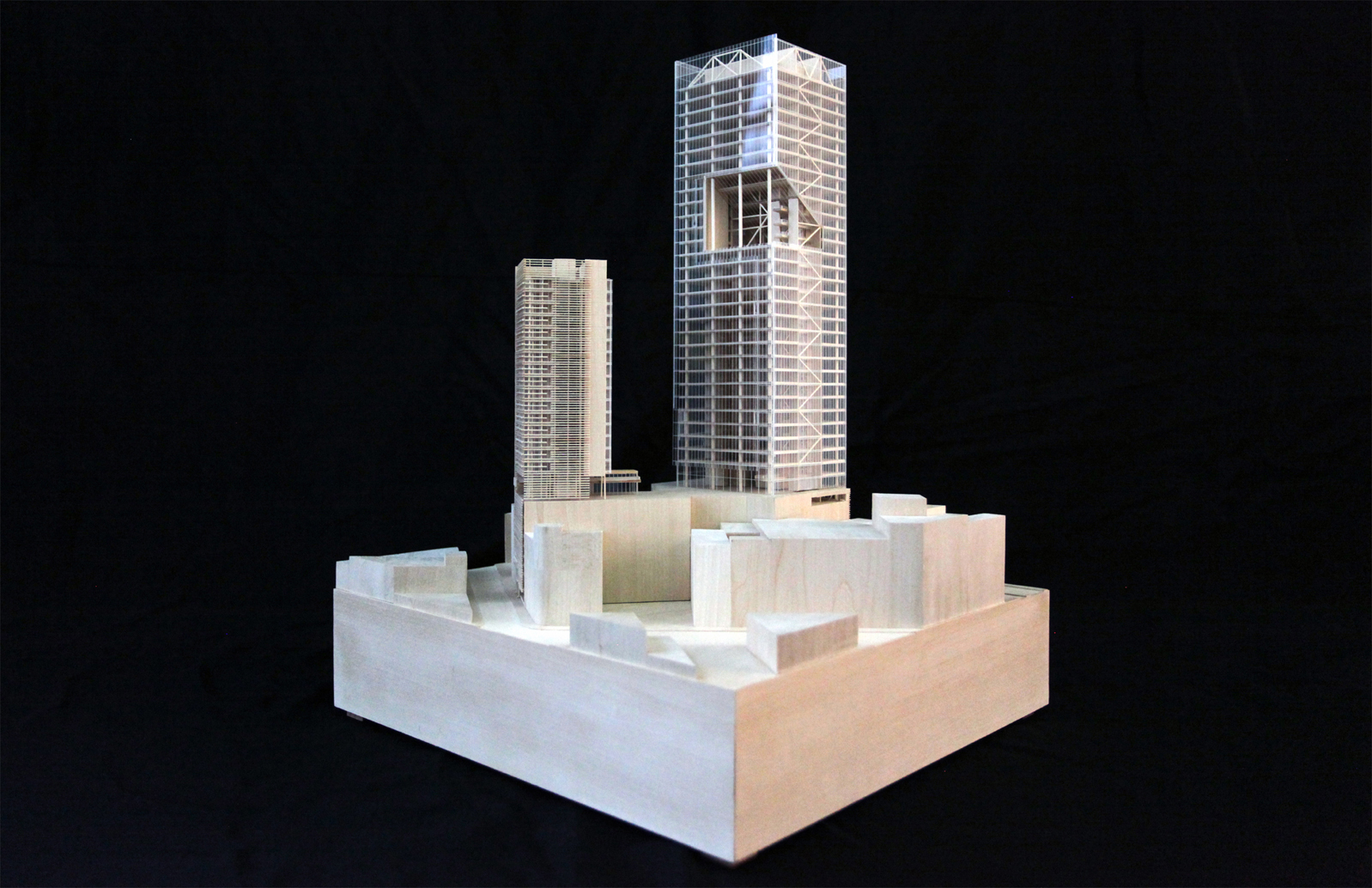 The new development is comprised of two buildings unified by a shared base. A 40-story mixed-use tower accommodates a range of programs, including high-end offices, retail space, restaurants, a fitness center, and space for parking. A 27-floor tower, following the same design principles as its counterpart, complements the activities of the complex. The overall design of the project considers current urban constraints while simultaneously accounting for the possibility of future development.